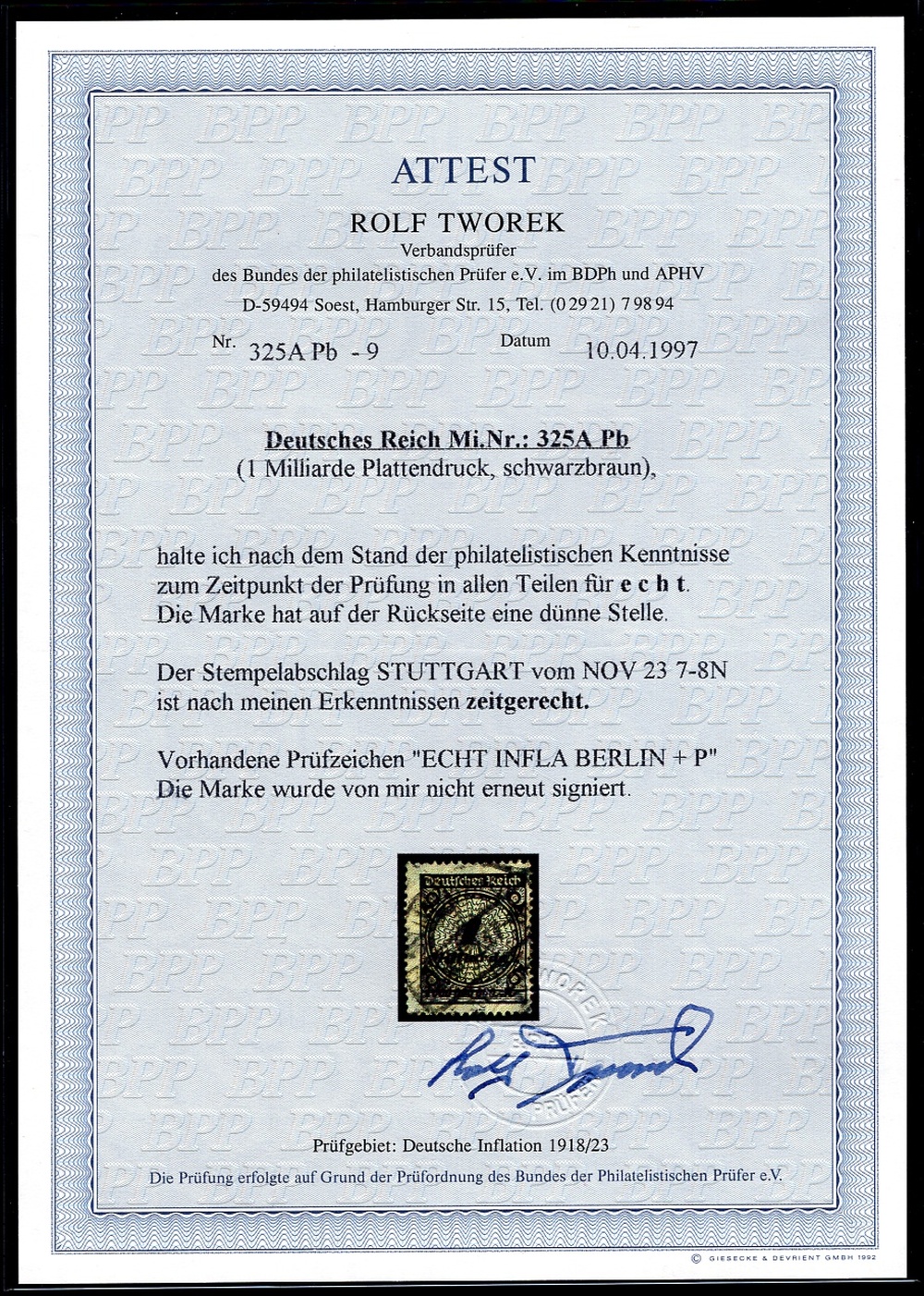 DR 1923 325Pb gestempelt DEUTSCHLANDRARITÄT ATTEST TWOREK BPP 9000€(H6797